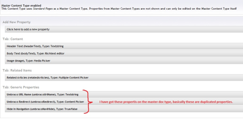 I have got a master document type with the (umbracoUrlName,umbracoRedirect,umbracoNavihide). called Standard Pages.