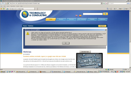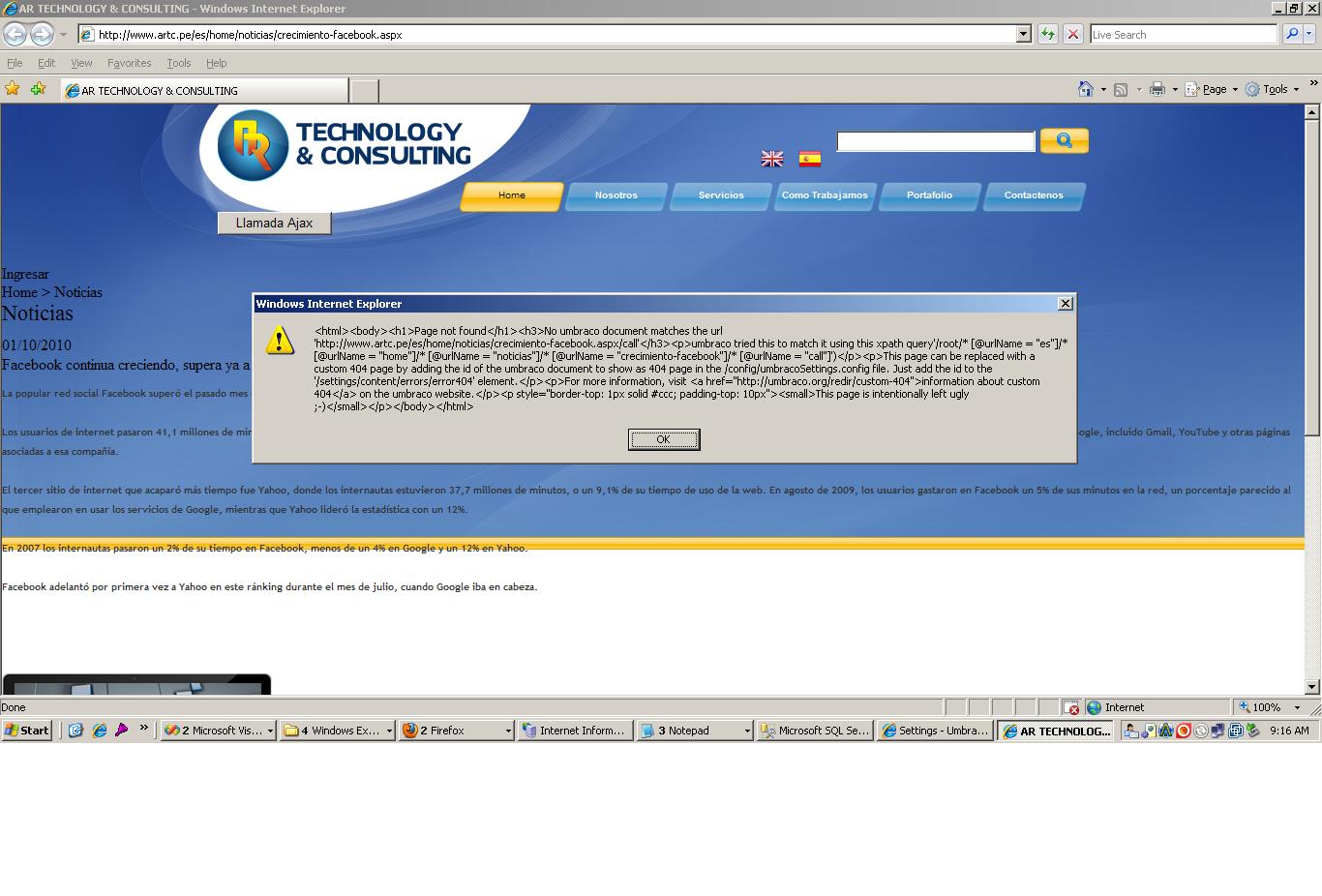 <html><body><h1>Page not found</h1><h3>No umbraco document matches the url 'http://www.artc.pe/es/home/noticias/crecimiento-facebook.aspx/call'</h3><p>umbraco tried this to match it using this xpath query'/root/* [@urlName = "es"]/* [@urlName = "home"]/* [@urlName = "noticias"]/* [@urlName = "crecimiento-facebook"]/* [@urlName = "call"]')</p><p>This page can be replaced with a custom 404 page by adding the id of the umbraco document to show as 404 page in the /config/umbracoSettings.config file. Just add the id to the '/settings/content/errors/error404' element.</p><p>For more information, visit <a href="http://umbraco.org/redir/custom-404">information about custom 404</a> on the umbraco website.</p><p style="border-top: 1px solid #ccc; padding-top: 10px"><small>This page is intentionally left ugly ;-)</small></p></body></html>