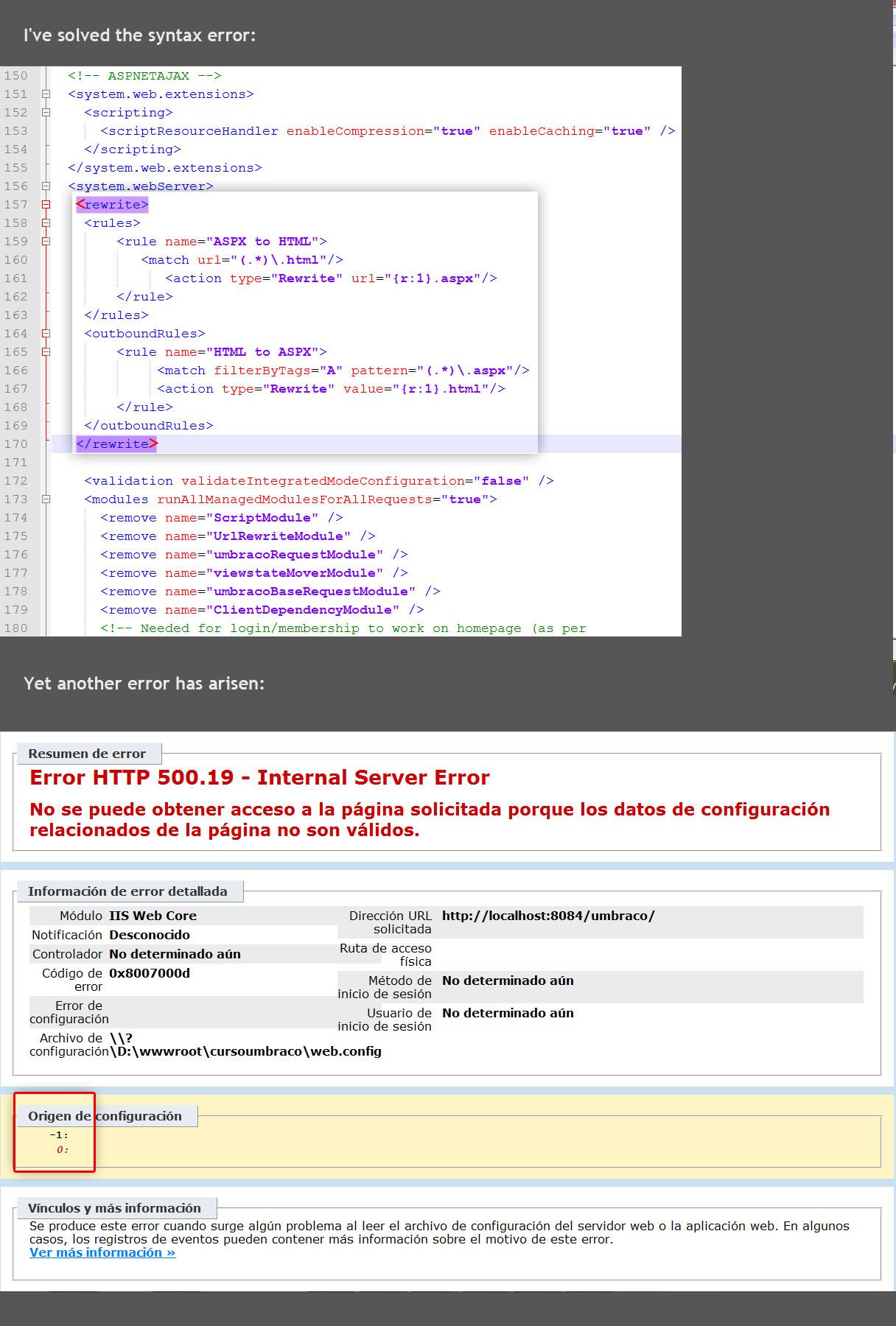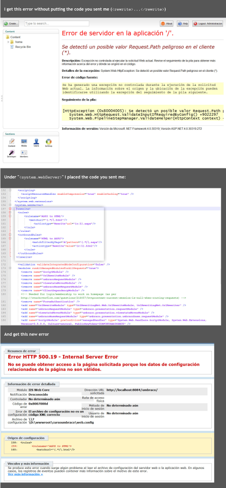 Nope. The ~/config/Urlrewriting.config is for UrlRewriting.Net. The snippet I gave is for the IIS URL rewriting module. You need to install it if it's not installed already. The download link: http://www.iis.net/download/urlrewrite. And than put that <rewrite> section under the <system.webServer> one. Also after installing the URL Rewrite module you can use IIS manager to maintain the rules with GUI.