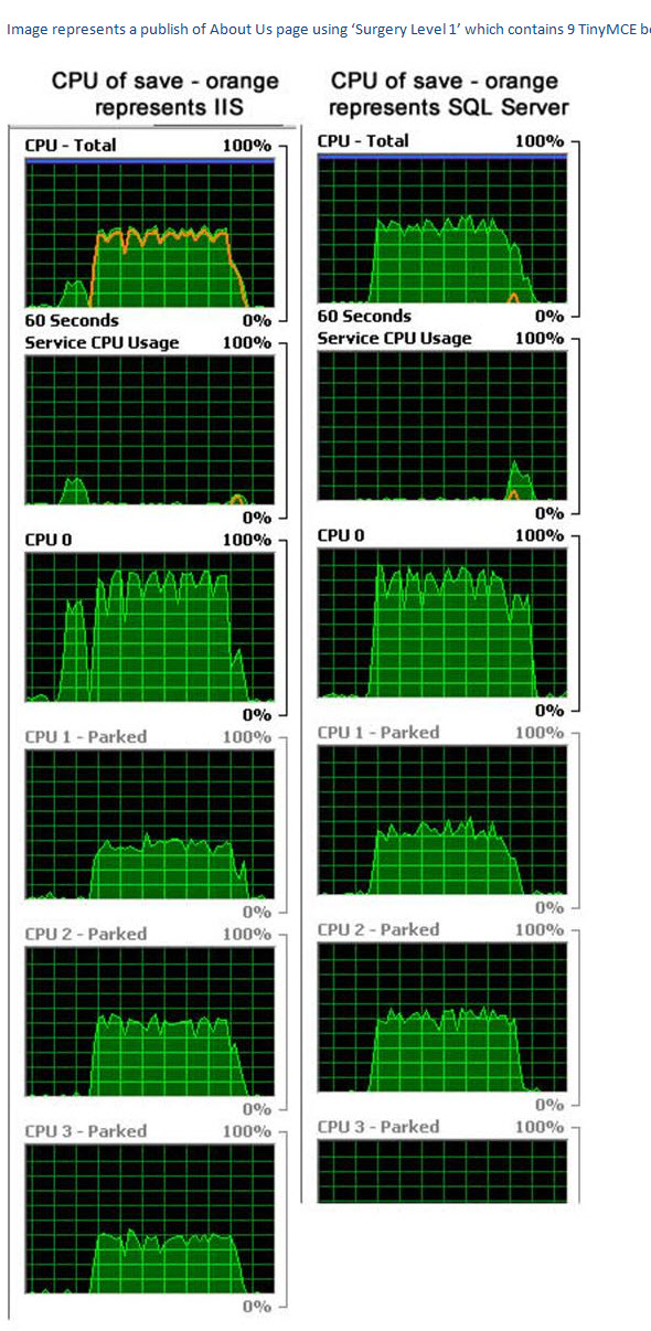 The CPU times for the offending (with TinyMCE) on save or load are as follows: CPU 1 90% usages. CPU 2,3,4 50% usage. Memory usage does not change much. SQL Server usage is only a small part of the usage 10% and only for 2-5 seconds. Most is IIS (80-90%) and lasts for the full duration of the publish/load 45-50 seconds). System usage is low 5%.