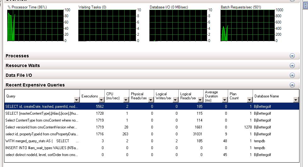 Its saying if i inspect the exe plan on one of the "expensive" queries that its stuck on some "cluster index" with a 100%.