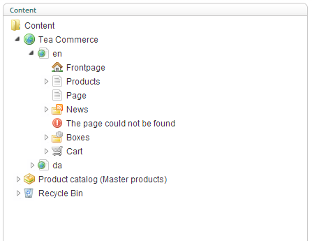 A short explanation of the different parts. All in all our structure is securing that ALL our websites can have multiple languages AND multiple subwebsites, if the customer should ever want it. The "Tea Commerce" node is the website node and will contain general information central for that site. The "en" and "da" nodes are the different languages for that particular website. The language nodes does usually not have a template, but can be given one if necessary. Any domains for the website is chosen on the language nodes with the "Manage hostnames" option. Beneath the language nodes the sites' actual content is placed.