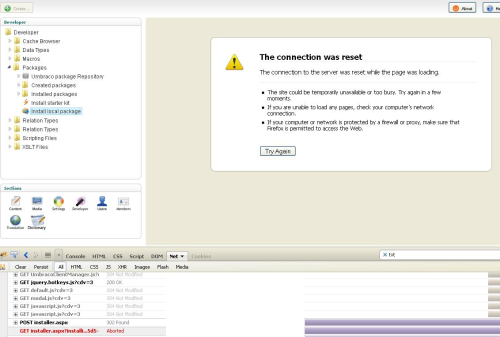 i can't seems to install packages, everytime install it i get the following error. pay attention to the "aborted" in firebug.