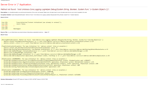 Method not found: 'Void Umbraco.Core.Logging.LogHelper.Debug... When modifying source