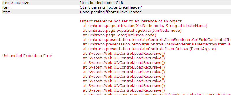 umbraco.presentation.templateControls.ItemRenderer.GetFieldContents(Item item) +209 umbraco.presentation.templateControls.ItemRenderer.ParseMacros(Item item) +89 umbraco.presentation.templateControls.Item.OnLoad(EventArgs e) +32