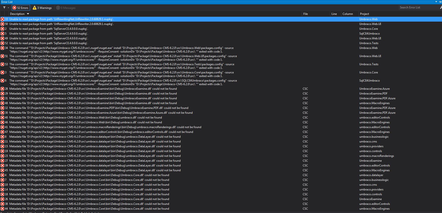 I've download the source code of Umbraco version 6.1.6 and 6.2 and when I build I get 52 error, same errors on both versions.