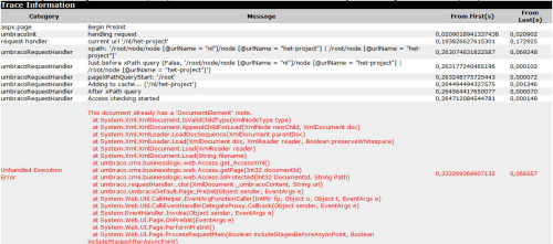 Thread information: Thread ID: 8 Thread account name: NT AUTHORITY\NETWORK SERVICE Is impersonating: False Stack trace: at System.Xml.XmlDocument.IsValidChildType(XmlNodeType type) at System.Xml.XmlDocument.AppendChildForLoad(XmlNode newChild, XmlDocument doc) at System.Xml.XmlLoader.LoadDocSequence(XmlDocument parentDoc) at System.Xml.XmlLoader.Load(XmlDocument doc, XmlReader reader, Boolean preserveWhitespace) at System.Xml.XmlDocument.Load(XmlReader reader) at System.Xml.XmlDocument.Load(String filename) at umbraco.cms.businesslogic.web.Access.get_AccessXml() at umbraco.cms.businesslogic.web.Access.getPage(Int32 documentId) at umbraco.cms.businesslogic.web.Access.IsProtected(Int32 DocumentId, String Path) at umbraco.requestHandler..ctor(XmlDocument _umbracoContent, String url) at umbraco.WebForm1.OnInit(EventArgs e) at System.Web.UI.Control.InitRecursive(Control namingContainer) at System.Web.UI.Page.ProcessRequestMain(Boolean includeStagesBeforeAsyncPoint, Boolean includeStagesAfterAsyncPoint)