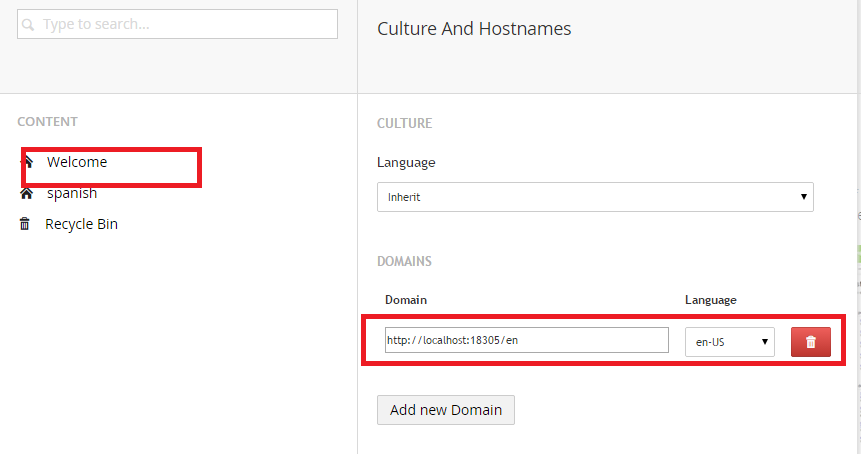 Old version of umbraco 4.11.8 and umbraoDomainPrefix under the umbracoSettings.config file.