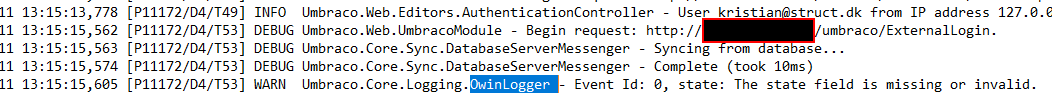 Umbraco.Core.Logging.OwinLogger - Event Id: 0, state: The state field is missing or invalid.