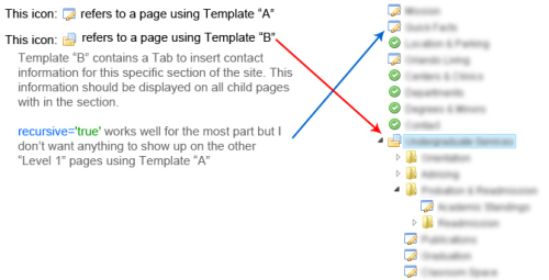 My Goal here is to allow my department's admin update his contact information on his main page (which uses Template "B") and then be able to show that information on all of his sub pages. I would also like not to create an additional template just to suit this need.