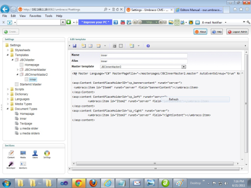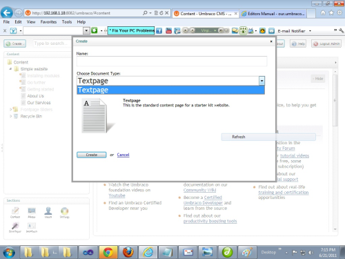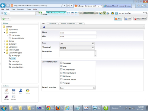 We have installed the Simple website (not empty website version) from the installation wizard at Umbraco. Using the video at the link -http://umbraco.com/help-and-support/video-tutorials/introduction-to-umbraco/sitebuilder-introduction/document-types we created a new document type (Inner), which was successfully done.
