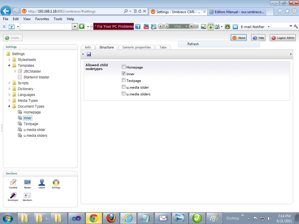 So if you would like to create the "Inner" document type underneath your Home Page, you'd need to edit the Home Page document type, click the Structure tab, and select "Inner" from the list and save it.