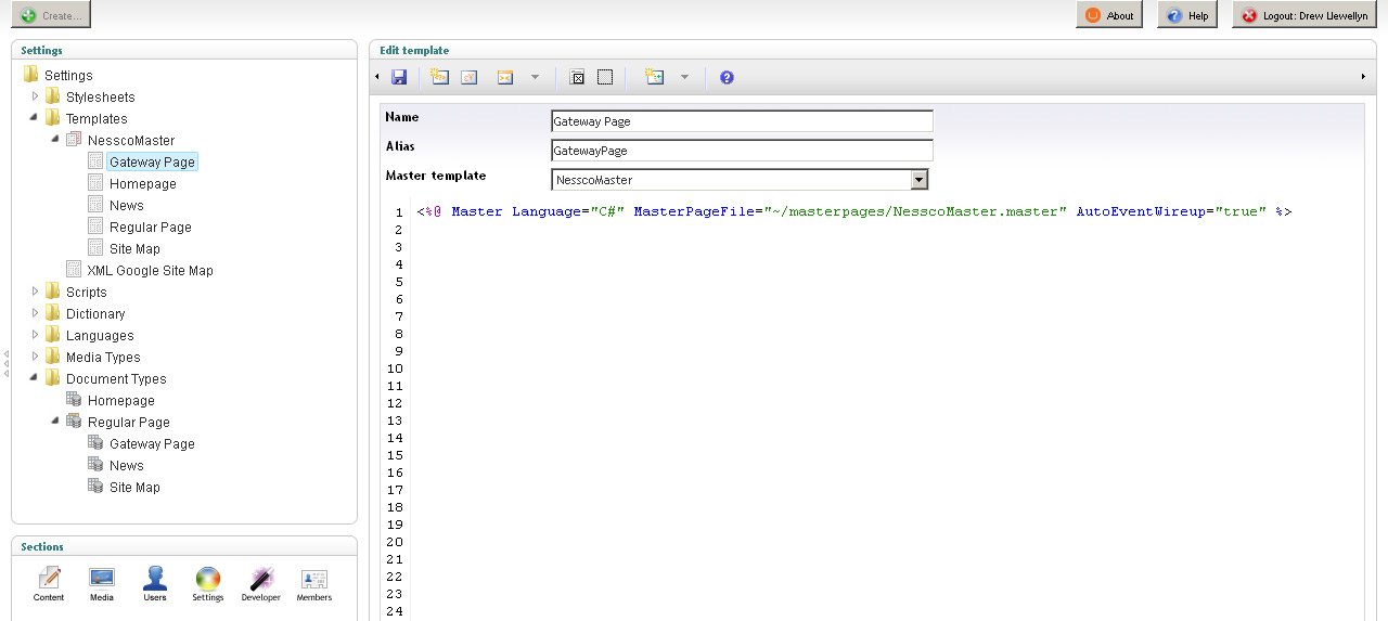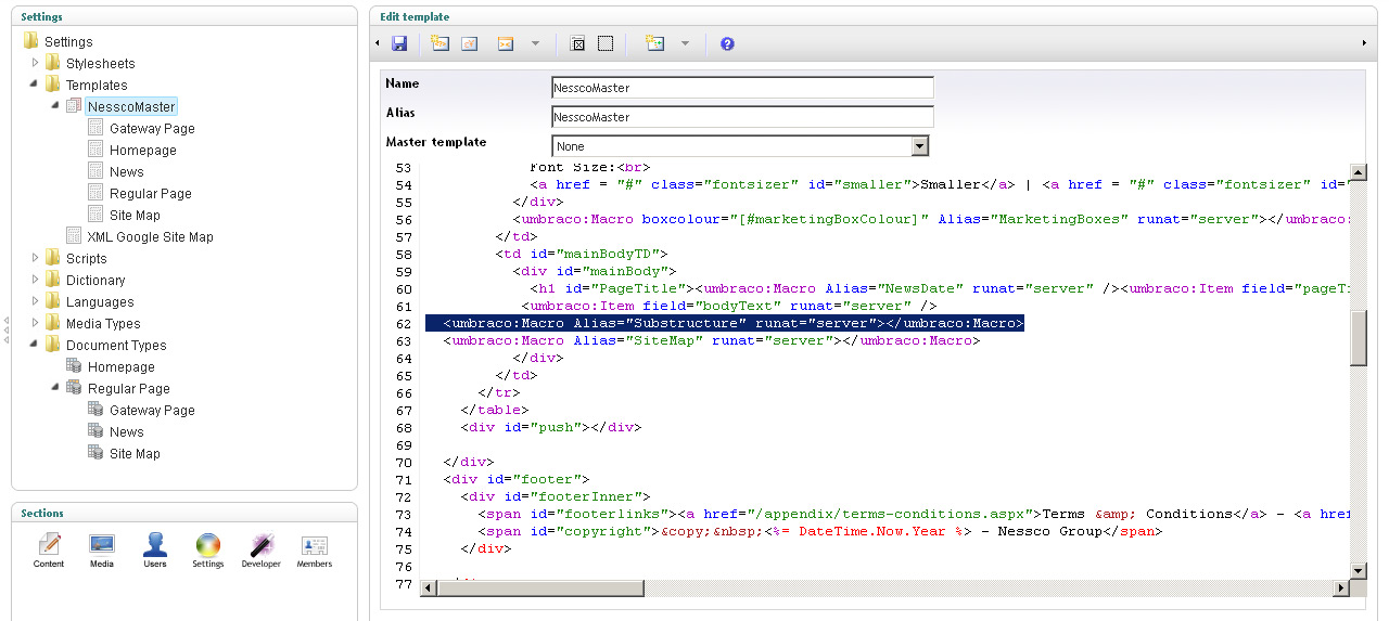 I have a master template which displays the page. I have sub-templates for different document types. To give an example of the problem I’ll reference one specifically which is a Gateway Page. This is the same as a regular page, except at the bottom of the content it will also list all the child-node pages of that page.