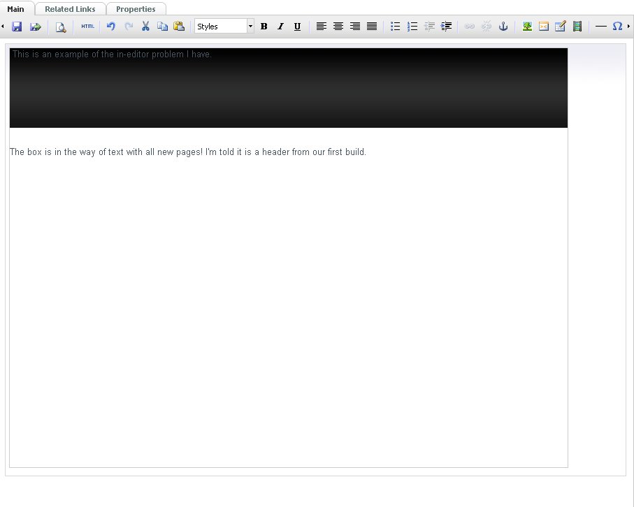 To give you an idea of the problem I have, when we use our basic template, a black box (Our original header before my time) appears, though it does not appear on the published page. This only happens when using the template, not a blank page. Is there a way to edit the template or copy the template and make a new version without it? It's really hard to edit text this way. I'm only an intern, and they've worked with it like this for years.