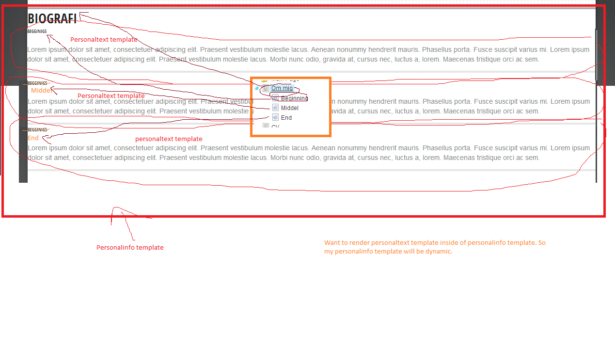 and under "Om mig" page have child/sub pages that use same template that calls "personaltext" but input is diffrent in property. Still only using "personaltext".