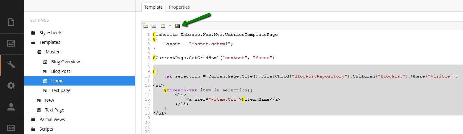 @{ var selection = CurrentPage.Site().FirstChild("BlogPostRepository").Children("BlogPost").Where("Visible"); } <ul> @foreach(var item in selection){ <li> <a href="@item.Url">@item.Name</a> </li> } </ul>