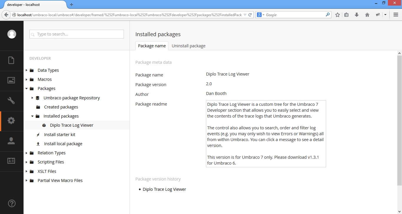 However, 'Trace Log' node is not created in 'Developer' section post installation (as per Diplo Trace documentation, it should be created). Log files are present in '/App_Data/Logs/'.