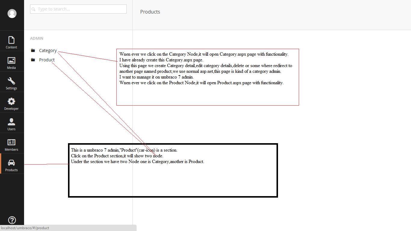 I want to create custom section in Umbraco 7 administrator.Then want to add more than one node on this custom section,after that I want to map those node with aspx page.