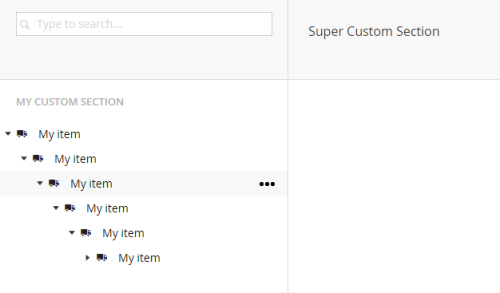 [PluginController("CustomSection")] [Umbraco.Web.Trees.Tree("CustomSection", "CustomSectionTree", "My custom section", iconClosed: "icon-doc")] public class CustomSectionTreeController : TreeController { protected override TreeNodeCollection GetTreeNodes(string id, FormDataCollection queryStrings) { var nodes = new TreeNodeCollection(); var item = this.CreateTreeNode(id, "-1", queryStrings, "My item", "icon-truck", true); nodes.Add(item); return nodes;