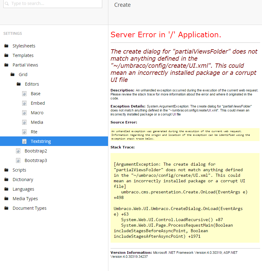 Umbraco 7.2 final: Getting YSOD when wanting to create partial view in the backoffie?