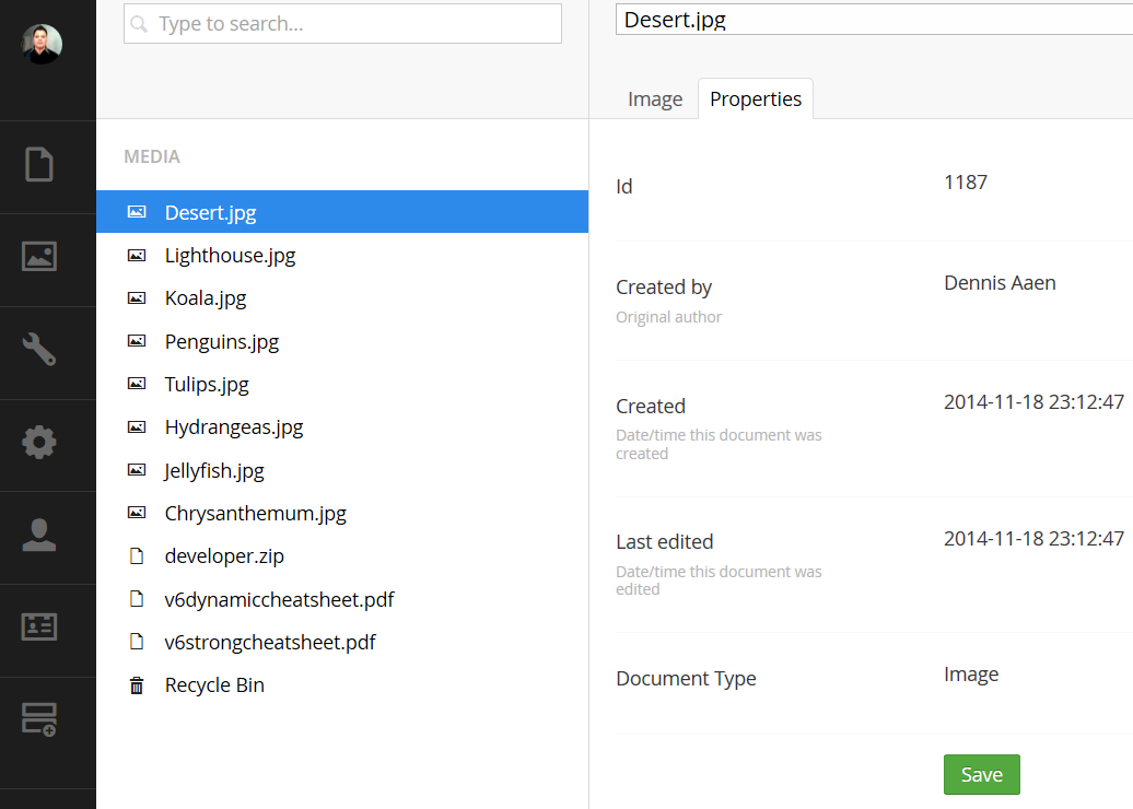 An easy way to make sure that you have the right id of the image that you want to use as your background image in your CSS is by going to the Umbraco Media section, find image, and click on this, and take the properties tab, in there you can find the image id.