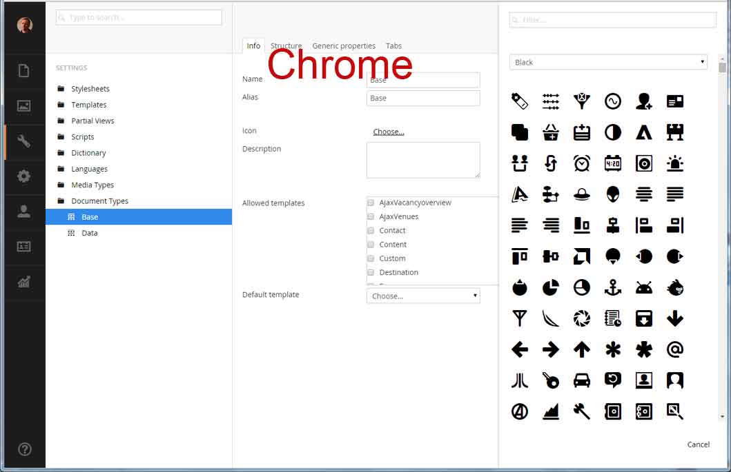 None of the new font icons are being displayed for selection in Umbraco in the document types section though.
