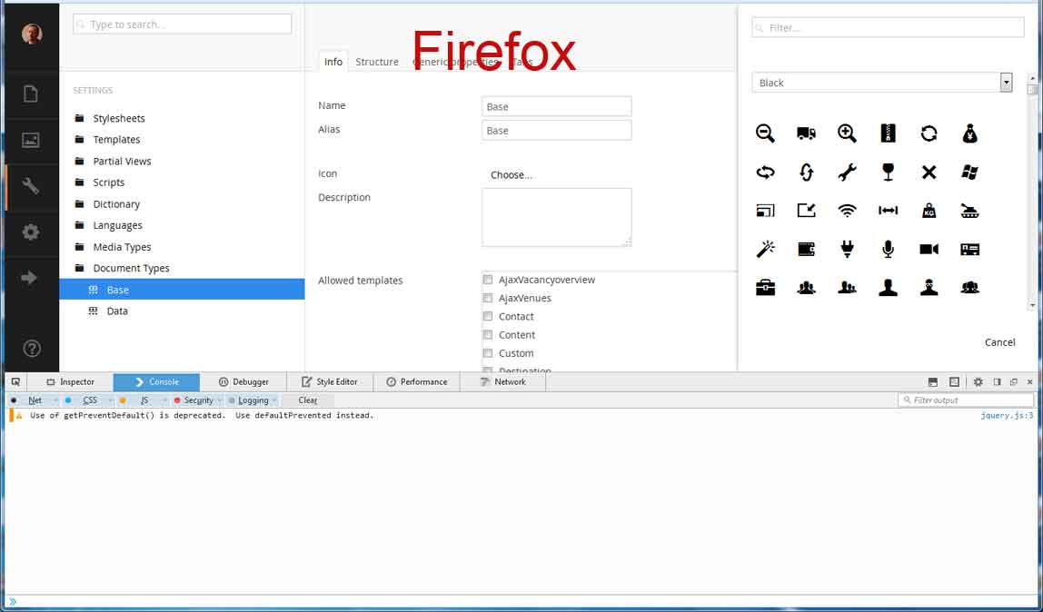 But at least these icons are only accessed by developers and after changing an icon, they are displayed fine in Firefox too. So for now maybe developers could use an other browser for this.. I also had this issue when changing the icon for a doctype, which is not just a Firefox thing: http://issues.umbraco.org/issue/U4-6182