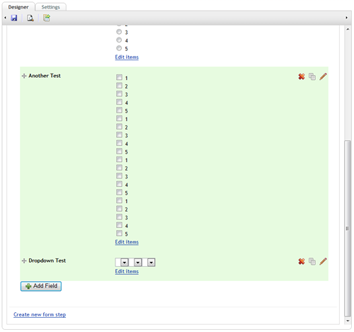 - click to edit the list items, don't bother editing, just click update, in the radio/checkbox fields the items will double up, e.g. become 1, 2, 3, 4, 5, 1, 2, 3, 4, 5. In the case of drop down fields, a second drop down will appear (you may need to do this a couple of times before it hapens). Doing this multiple times will cause another set of items to appear in the list.