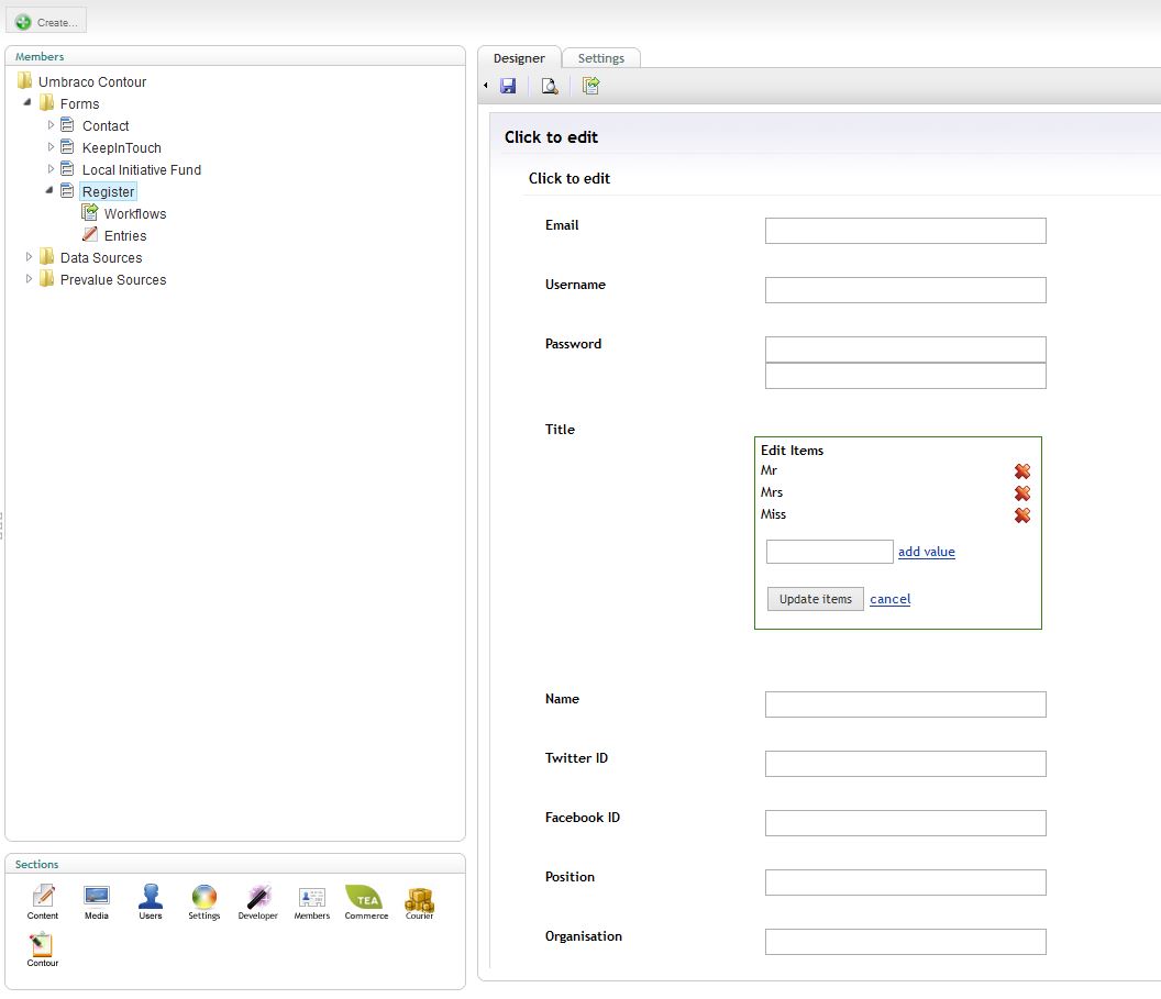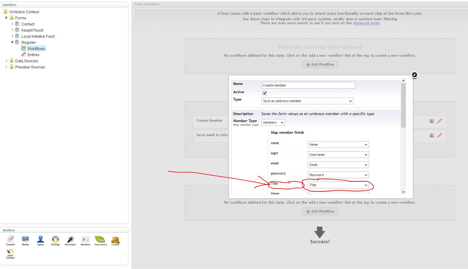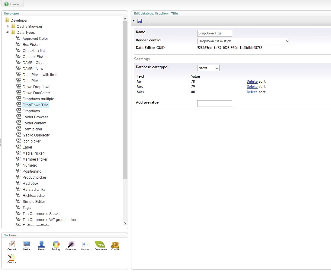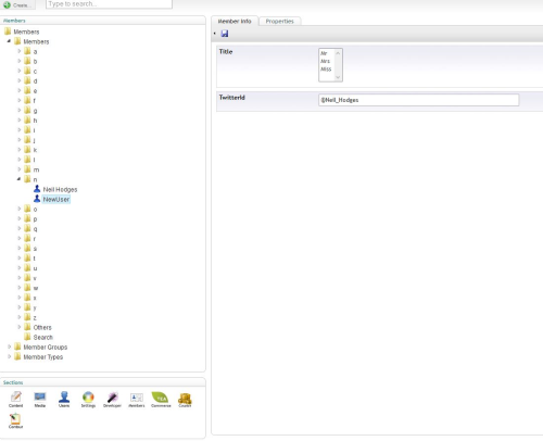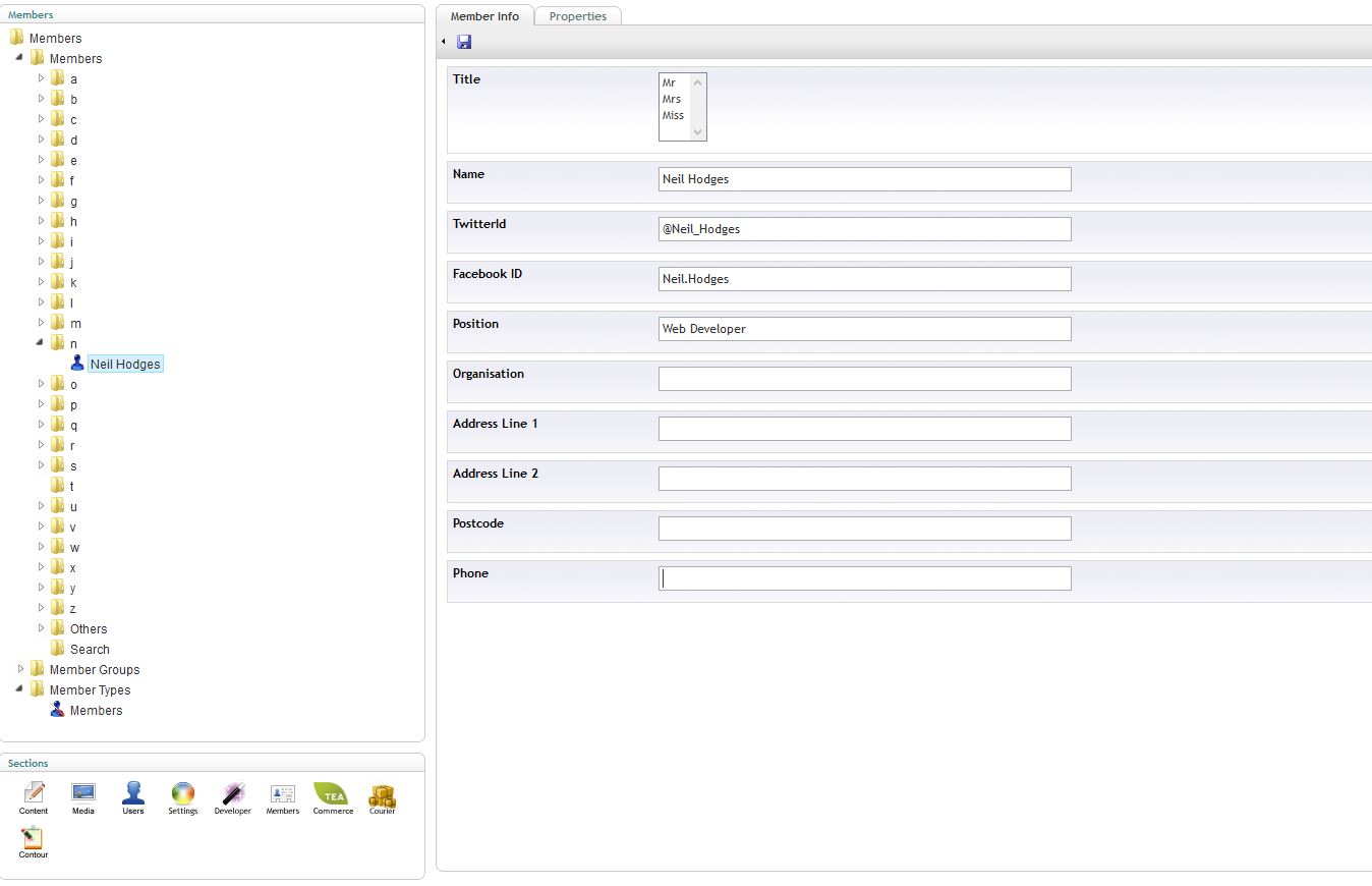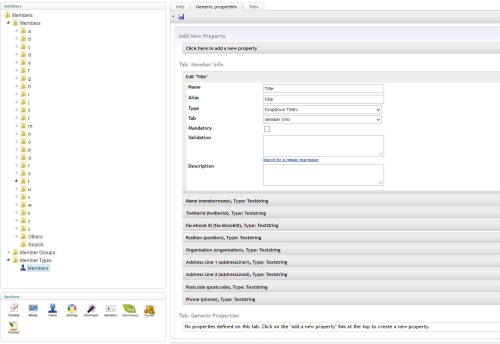 Above are the Members properties, with the Title drop down using my Custom DataType i created that is a drop down with the values Mr, Mrs and Miss