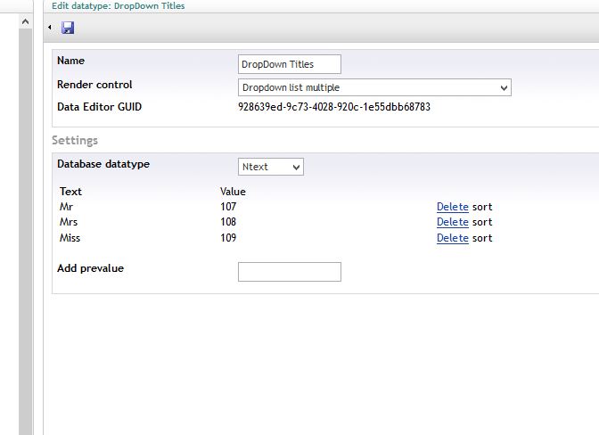 Yeah that won't work then :) you' need to create a new prevalue source, umbraco datatype prevalues (read only) and select dropdown titles, then on your form update the field to use the prevalue source, it should all work then :)