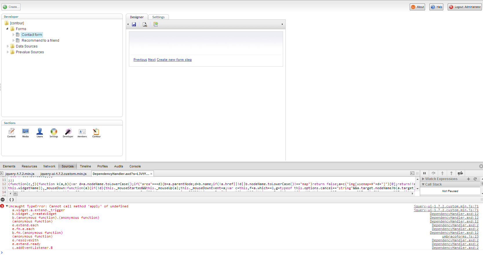 Uncaught TypeError: Cannot call method 'apply' of undefined jquery-ui-1.7.2.custom.min.js:71 a.widget.a.extend._trigger jquery-ui-1.7.2.custom.min.js:71 b.Widget._createWidget DependencyHandler.axd:12 b.(anonymous function).(anonymous function) DependencyHandler.axd:12 (anonymous function) DependencyHandler.axd:12 e.extend.each DependencyHandler.axd:2 e.fn.e.each DependencyHandler.axd:2 b.fn.(anonymous function) DependencyHandler.axd:12 (anonymous function) umbracoforms.js:23 e.resolveWith DependencyHandler.axd:2 e.extend.ready DependencyHandler.axd:2 c.addEventListener.B DependencyHandler.axd:2