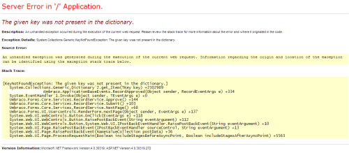 Ok and anything attached to the contour event model? From the error I see ...Umbraco.AppicationBaseEvents.RecordApprovede (... is not visible) so I assume this is custom code? And looks like it's coming from the custom code...