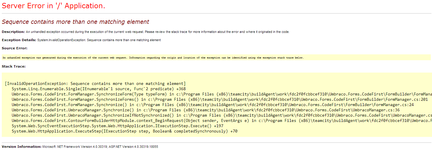 After adding CodeFirst forms for member registration - http://www.nibble.be/?p=205 I am getting this error the first time the site loads:Sequence contains more than one matching element