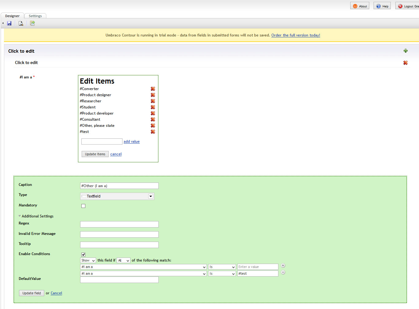 I have upgraded the version of Contour to the latest version and have ensured I have copied over the new script.cshtml file to each individual folder in the Views folder however the condition is still not working even when previewing via the CMS (see attached screenshot). Any ideas?? Additionally, are you able to send me an export of the test form you used that worked?