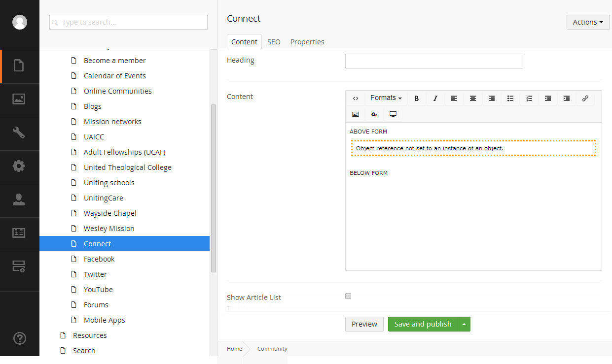 This error occurs when I try to insert the conutour macro in the property I've defined for some document type. The app throws an error ("NullReferenceException") and doesn't render the HTML of the macro in the RichTextEditor, but it does when I access to the page from the site.