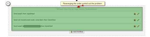 public class CustomSendEmailWorkflow : WorkflowType { [Setting("Email from", description = "Enter the from email", control = "Umbraco.Forms.Core.FieldSetting.TextField")] public string EmailFrom { get; set; } [Setting("Email to", description = "Enter the to email", control = "Umbraco.Forms.Core.FieldSetting.TextField")] public string EmailTo { get; set; } [Setting("Email cc", description = "Enter the cc email", control = "Umbraco.Forms.Core.FieldSetting.TextField")] public string EmailCc { get; set; } [Setting("Email bcc", description = "Enter the bcc email", control = "Umbraco.Forms.Core.FieldSetting.TextField")] public string EmailBcc { get; set; } [Setting("Subject", description = "Enter the subject", control = "Umbraco.Forms.Core.FieldSetting.TextField")] public string Subject { get; set; } [Setting("Message", description = "Enter the message", control = "Umbraco.Forms.Core.FieldSetting.TextArea")] public string Message { get; set; } public CustomSendEmailWorkflow() { base.Id = new Guid("c8a976da-0ced-4680-9296-53afb9b41df4"); base.Name = "Custom send email"; base.Description = "Send a message from a specific email address to a specific email address"; } public override List<Exception> ValidateSettings() { List<Exception> i = new List<Exception>(); if (string.IsNullOrEmpty(this.EmailFrom)) { i.Add(new Exception("'Email From' setting has not been set")); } if (string.IsNullOrEmpty(this.EmailTo)) { i.Add(new Exception("'Email To' setting has not been set")); } if (string.IsNullOrEmpty(this.Subject)) { i.Add(new Exception("'Subject' setting has not been set'")); } if (string.IsNullOrEmpty(this.Message)) { i.Add(new Exception("'Message' setting has not been set'")); } return i; } public override WorkflowExecutionStatus Execute(Record record, RecordEventArgs e) { var pageTitle = Node.GetCurrent().Name; MailMessage i = new MailMessage(); i.From = new MailAddress(EmailFrom); if (!string.IsNullOrEmpty(EmailTo)) { foreach (string email in EmailTo.Split(',')) { i.To.Add(new MailAddress(email)); } } if (!string.IsNullOrEmpty(EmailCc)) { foreach (string email in EmailCc.Split(',')) { i.CC.Add(new MailAddress(email)); } } if (!string.IsNullOrEmpty(EmailBcc)) { foreach (string email in EmailBcc.Split(',')) { i.Bcc.Add(new MailAddress(email)); } } i.Subject = this.Subject.Replace("{pageTitle}", pageTitle); i.IsBodyHtml = true; string body = this.Message.Replace("\n", "<br/>"); string fieldHtml = @" <table>"; foreach (RecordField rf in record.RecordFields.Values.OrderBy(x => x.Field.SortOrder)) { if (rf.Field.FieldType.GetType().ToString() == "Umbraco.Forms.Core.Providers.FieldTypes.FileUpload") { if (!string.IsNullOrEmpty(rf.ValuesAsString())) { //If it's a FileUpload add the file as an attachment. i.Attachments.Add(new Attachment(HttpContext.Current.Server.MapPath(rf.ValuesAsString()))); } } else { //Add the info into the table. fieldHtml += @" <tr> <td>" + rf.Field.Caption + @" </td> <td>" + rf.ValuesAsString() + @" </td> </tr> "; } } fieldHtml += @" </table>"; i.Body = body.Replace("{velden}", fieldHtml).Replace("{pageTitle}", pageTitle); SmtpClient smtpClient = new SmtpClient(); smtpClient.Send(i); return WorkflowExecutionStatus.Completed; } }Jeroen