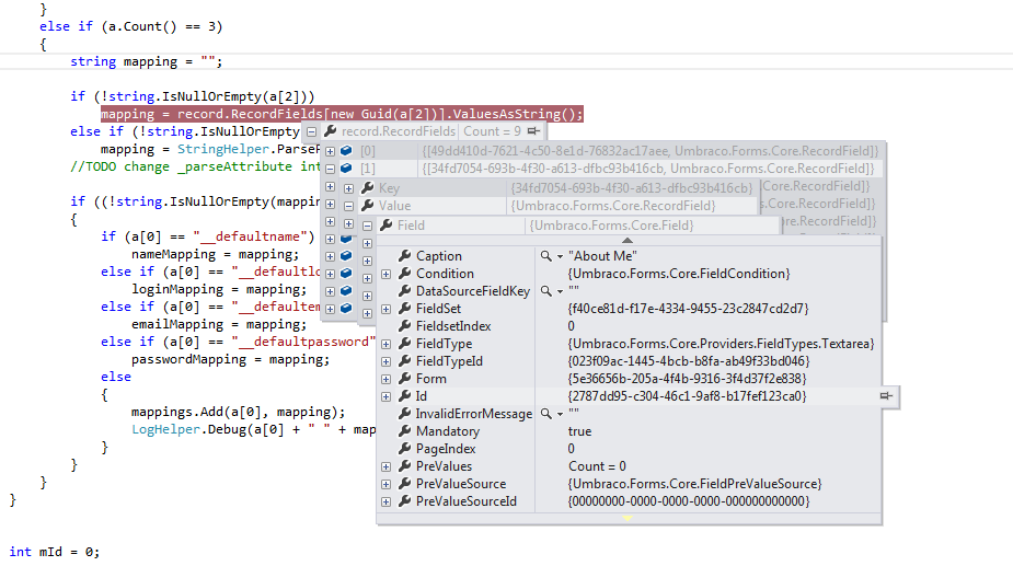 //mapping = record.RecordFields[new Guid(a[2])].ValuesAsString();