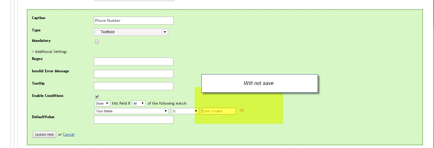 The problem we are having (see images below) is that when the condition is set to Hide, the field "phone number" shows, but when I type in "Barg", the required condition, in the "Your name" field, the phone number field fails to render on the form as it is supposed to. The exact opposite happens when the condition is Show. So the field is initially being recognized by Enable Conditions, but the conditions are not executing. I also tried this w/checkboxes - same issue.
