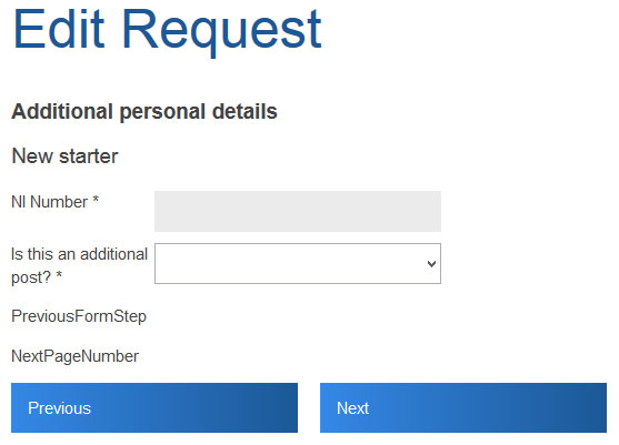 <script type="text/javascript"> $(document).ready(function () { $(".next").click(function () { if($("#b0a3522d-4daa-47f1-8760-72107507afc6").val() != null) { switch ($("#b0a3522d-4daa-47f1-8760-72107507afc6").val()) { case "New starter": $("#FormStep").val("3"); $("#RequestType").val("New Starter"); break; case "Change of personal details": $("#FormStep").val("4"); $("#RequestType").val("Change of Personal Details"); break; case "Contract extension": $("#FormStep").val("5"); $("#RequestType").val("Contract Extension"); break; case "Contract amendment": $("#FormStep").val("6"); $("#RequestType").val("Contract Amendment"); break; case "Leaver": $("#FormStep").val("7"); $("#RequestType").val("Leaver"); break; case "Maternity/Adoption leave": $("#FormStep").val("8"); $("#RequestType").val("Maternity/Adoption Leave"); break; } } if ($(".nextpage").val() != null) { var currentPage = parseInt($(".nextpage").val(), 10); $("#FormStep").val(currentPage); } }); $(".cancel").click(function () { $("#FormStep").val(2); if ($(".previouspage").val() != null) { var currentPage = parseInt($(".previouspage").val(), 10); ++currentPage; $("#FormStep").val(currentPage); } }); }); </script>