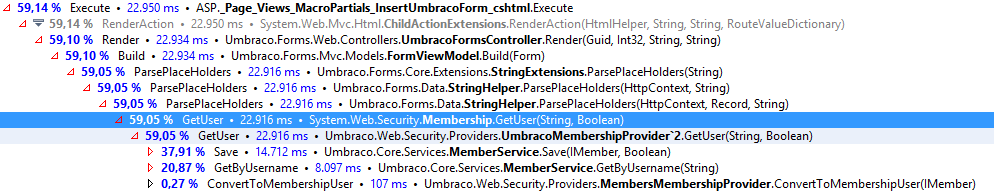 We see that the ParsePlaceHolders is being requested a lot (in the Build(Form) method in 4 foreach loops). And the Membership.GetUser is requested foreach ParsePlaceHolder.