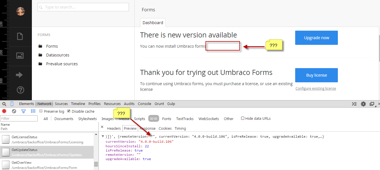 But nothing happens. With fiddler I saw that I get a 500er error when clicking on the download/upgrade button from: /umbraco/backoffice/UmbracoForms/Updates/InstallLatest?version=