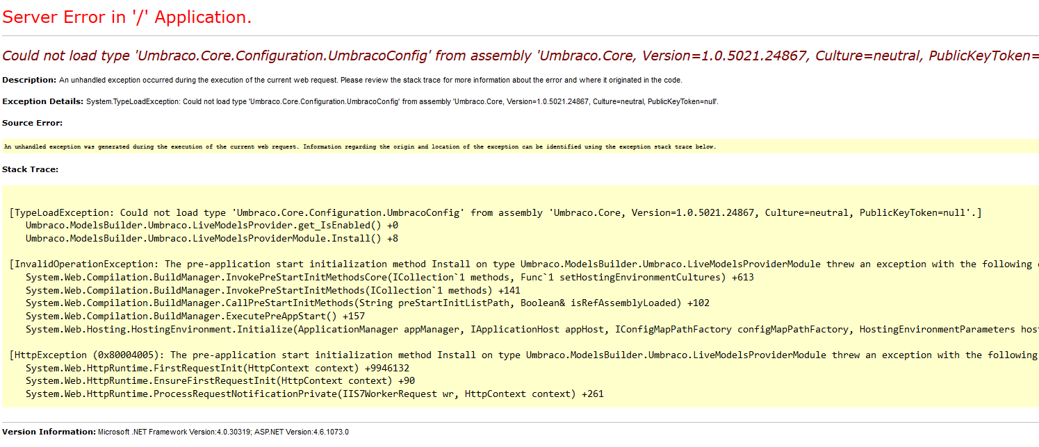 Could not load type 'Umbraco.Core.Configuration.UmbracoConfig' from assembly 'Umbraco.Core, Version=1.0.5021.24867, Culture=neutral, PublicKeyToken=null'.