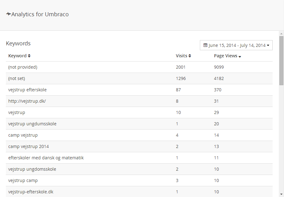 angular.module("umbraco").controller("Analytics.KeywordController", function ($scope, $location, statsResource, settingsResource, assetsService) { var profileID = ""; // Item List Arrays $scope.items = []; $scope.sort = function (newSortField) { if ($scope.sortField == newSortField) $scope.descending = !$scope.descending; $scope.sortField = newSortField; $('th i').each(function () { $(this).removeClass().addClass('fa fa-sort'); //icon-sort // reset sort icon for columns with existing icons }); if ($scope.descending) $('#' + newSortField + ' i').removeClass().addClass('fa fa-sort-down'); //icon-caret-down else $('#' + newSortField + ' i').removeClass().addClass('fa fa-sort-up'); //icon-caret-up }; $scope.dateFilter = settingsResource.getDateFilter(); $scope.loadingViews = true; $scope.$watch('dateFilter', function () { $scope.loadingViews = true; settingsResource.setDateFilter($scope.dateFilter.startDate, $scope.dateFilter.endDate); //Get Profile settingsResource.getprofile().then(function(response) { $scope.profile = response.data; profileID = response.data.Id; if (profileID == null || profileID == "") { $location.path("/analytics/analyticsTree/edit/settings"); return; } $scope.loadingViews = false; //Get Browser via statsResource - does WebAPI GET call statsResource.getkeywords(profileID,$scope.dateFilter.startDate, $scope.dateFilter.endDate).then(function (response) { $scope.keywords = response.data.ApiResult; angular.forEach($scope.keywords.Rows, function (item) { $scope.items.push({ keyword: item.Cells[0], visits: parseInt(item.Cells[1]), pageviews: parseInt(item.Cells[2]) }); }); var defaultSort = "pageviews"; // default sorting $scope.sortField = defaultSort; $scope.descending = true; $('th i').each(function () { $(this).removeClass().addClass('fa fa-sort'); //icon-sort // reset sort icon for columns with existing icons }); if ($scope.descending) $('#' + defaultSort + ' i').removeClass().addClass('fa fa-sort-down'); //icon-caret-down else $('#' + defaultSort + ' i').removeClass().addClass('fa fa-sort-up'); //icon-caret-up //$scope.filteredItems = []; //var chartData = response.data.ChartData; ////Create Bar Chart //var ctx = document.getElementById("keywords").getContext("2d"); //var keywordsChart = new Chart(ctx).Bar(chartData); }); }); }); //load the seperat css for the editor to avoid it blocking our js loading assetsService.loadCss("/umbraco/assets/css/umbraco.css"); assetsService.loadCss("/App_Plugins/Analytics/backOffice/AnalyticsTree/icons/css/font-awesome.css"); });It looks like this: