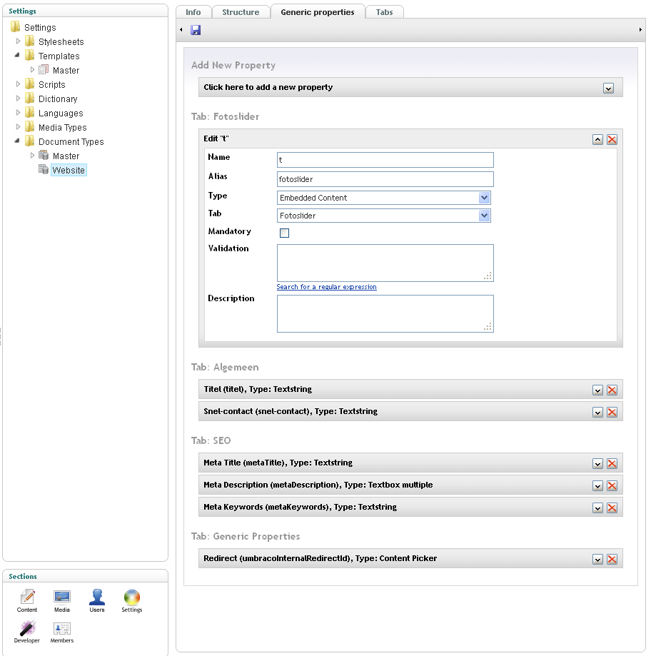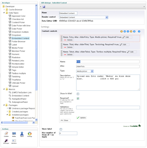 I installed the Embedded Content package, create a data type with my preferred options, then went to doc types to make "Embedded Content" a property of the master doctype "Website", using an alias called "fotoslider" for this.