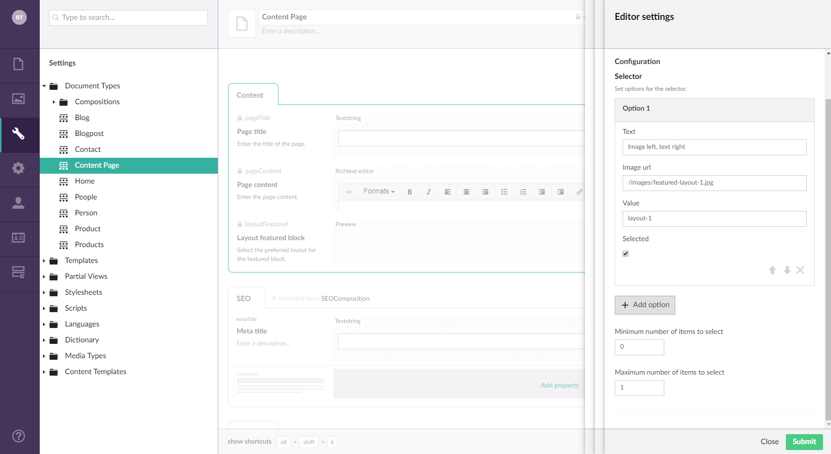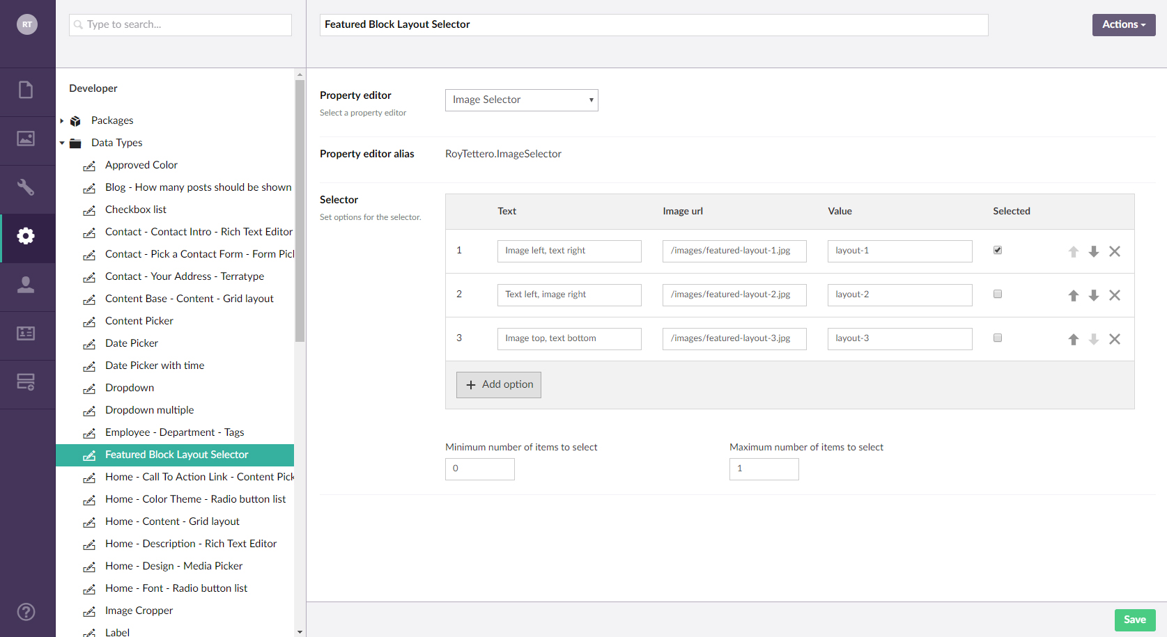You can also set the minimum and maximum number of options that the content-editor is allowed to select.
