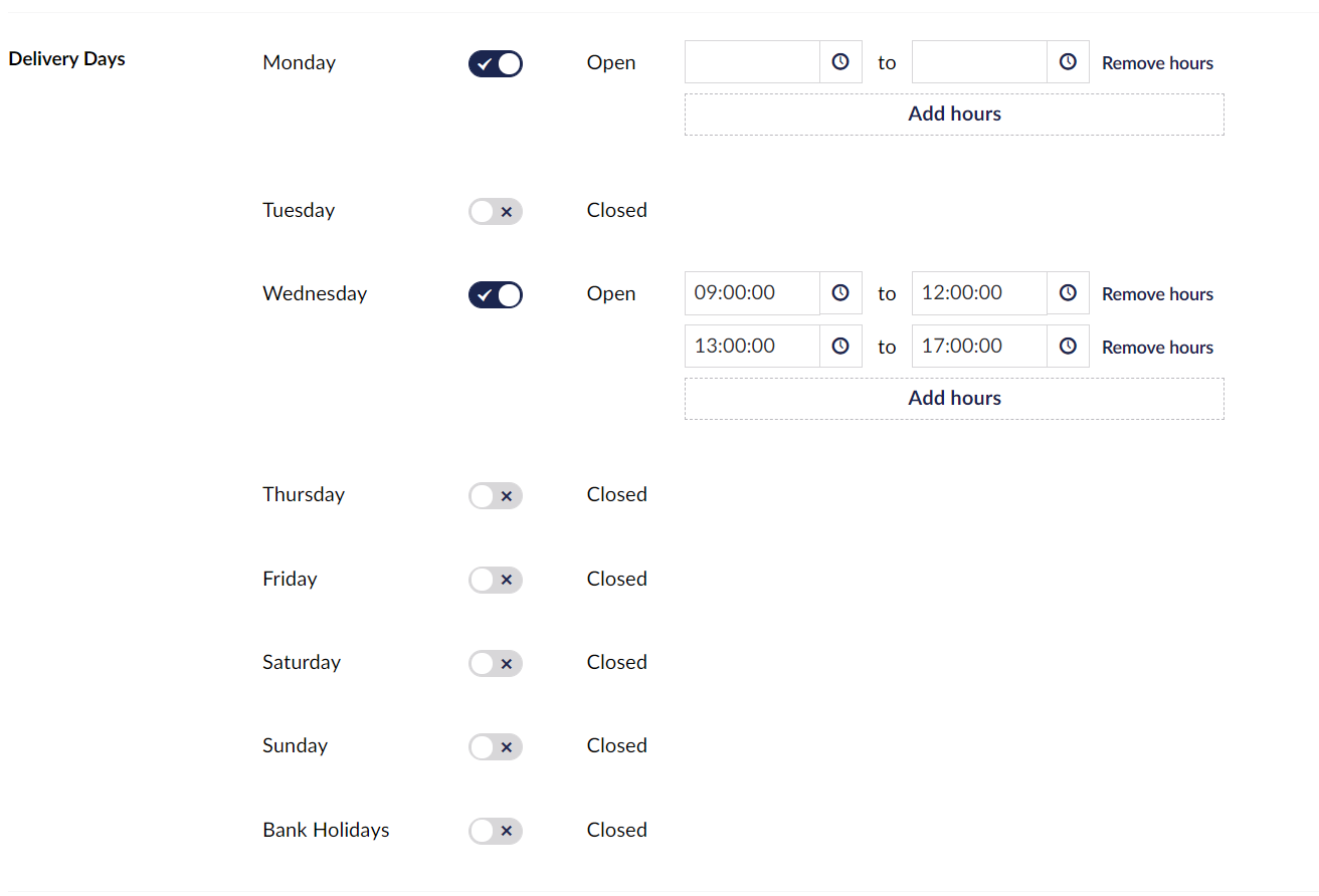 Monday through to Sunday and optionally Bank Holidays, set each day Open or Closed with multiple ranges of times in either 24- or 12-hour time. Each time range can be flagged with "By Appointment".
