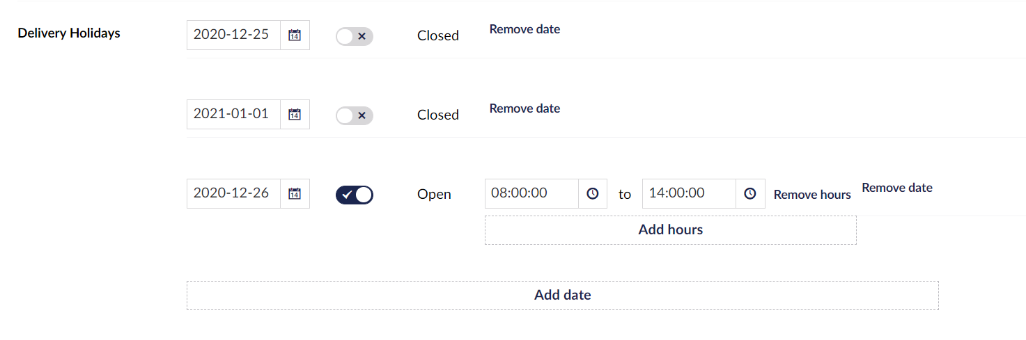 Adds the ability to specify specific dates, with the same set of features for Standard Business Hours.