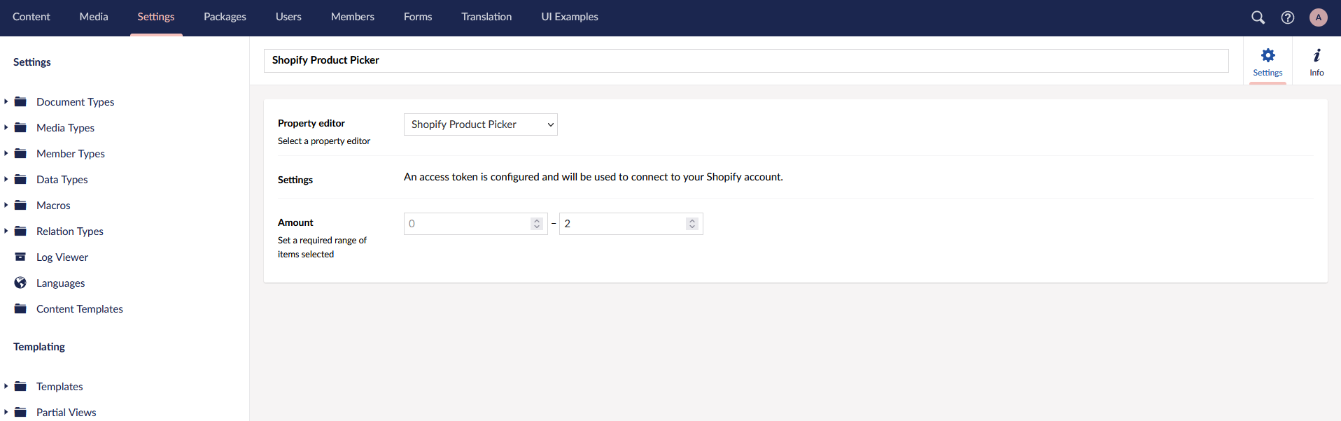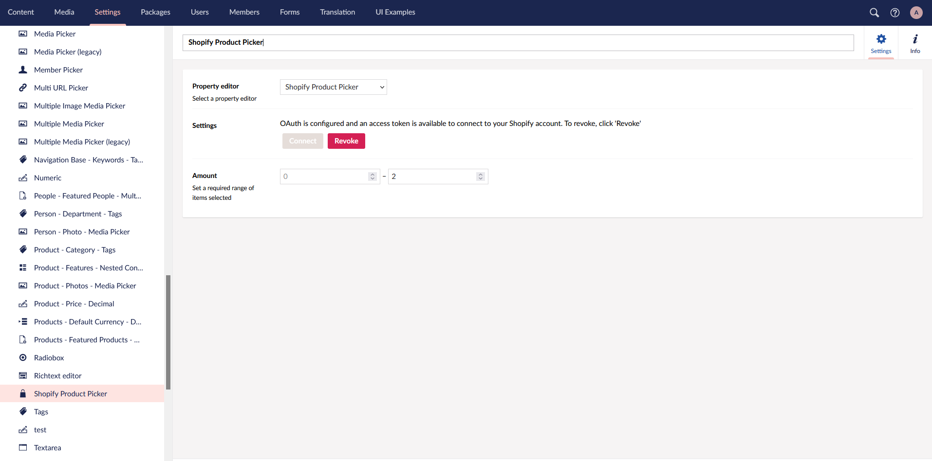 To use the products picker, a new data type should be created based on the Shopify Products Picker property editor. The settings in `Web.config` will be checked and a message prompted indicating whether the authentication flow is valid.