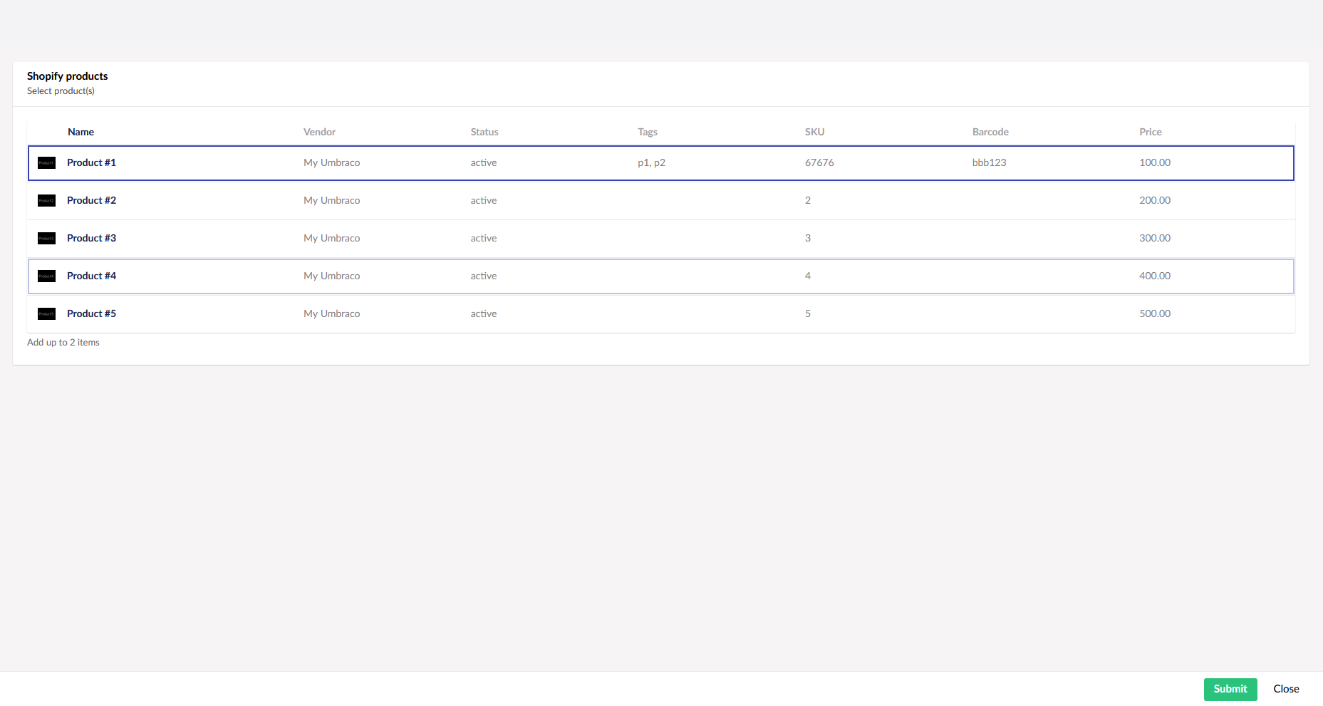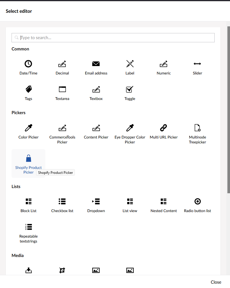 This integration adds a backoffice product picker that can be added as a property editor for content, with a value converter providing a strongly typed model for rendering.