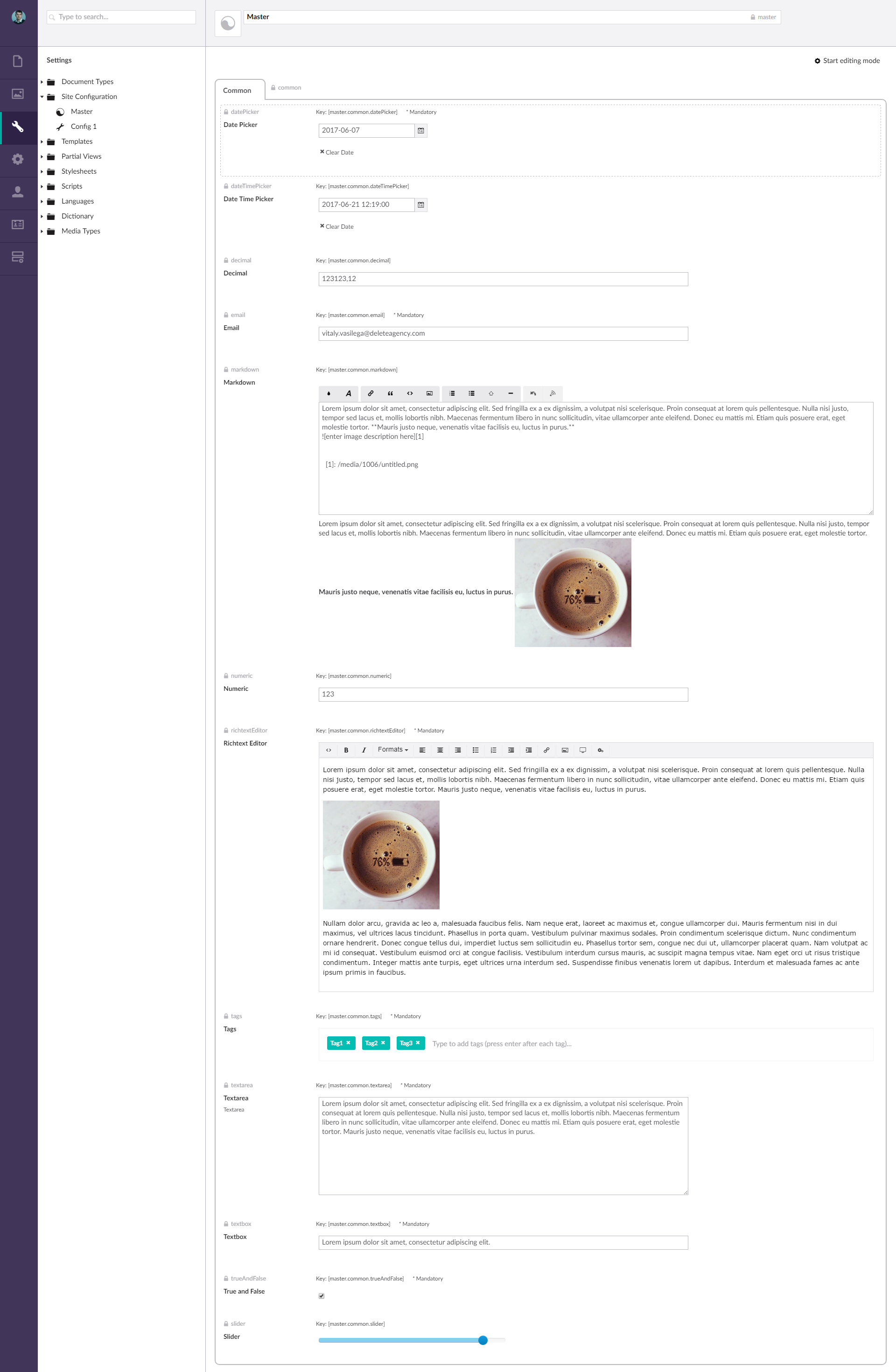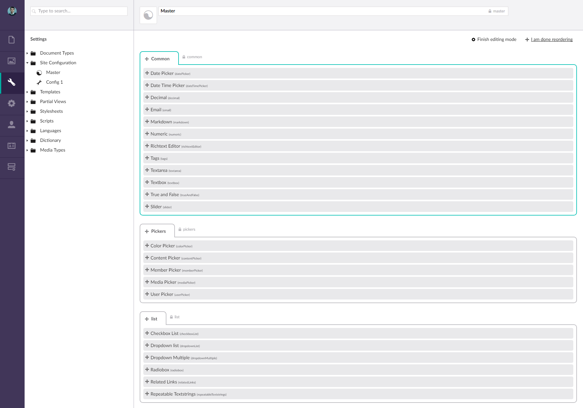 The plugin uses the same interface as ‘Document Type’ editor, with the difference that uConfiguration is a variant that is updated and improved.